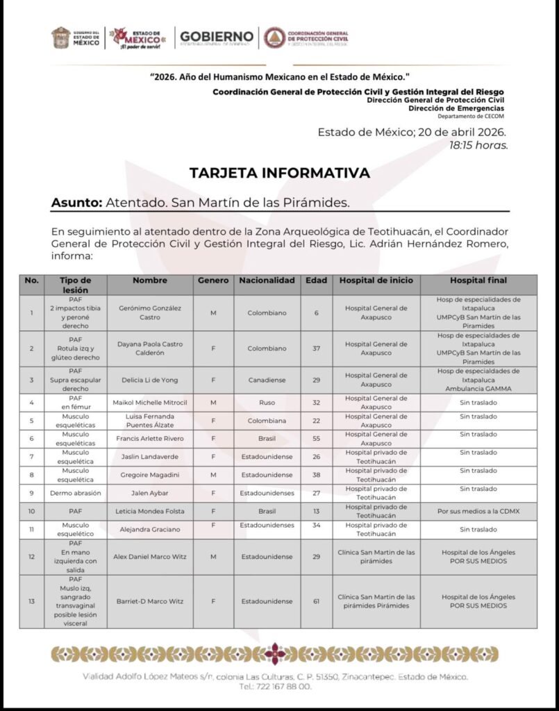 El Gabinete de Seguridad de México informó a través de redes sociales la lista del seguimiento de personas afectadas tras el tiroteo en la zona arqueológica de Teotihuacán.