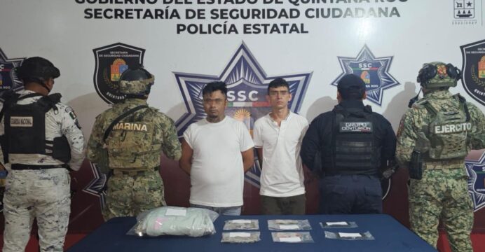 Cancún. Elementos del Grupo Centurión, en coordinación con la Secretaría de Marina, la Secretaría de la Defensa Nacional y la Guardia Nacional, lograron la detención de Roberto Carlos “N” y César Adrián “N”, presuntos implicados en delitos contra la salud en el municipio de Benito Juárez.