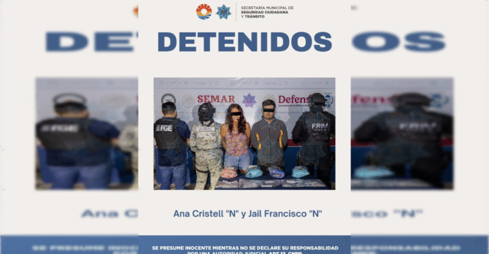 Cancún, 4 de diciembre.- En una acción coordinada entre la Fiscalía General del Estado (FGE), autoridades federales y la Secretaría Municipal de Seguridad Ciudadana y Tránsito (SMSCyT), fueron detenidos una mujer y un hombre por narcomenudeo.