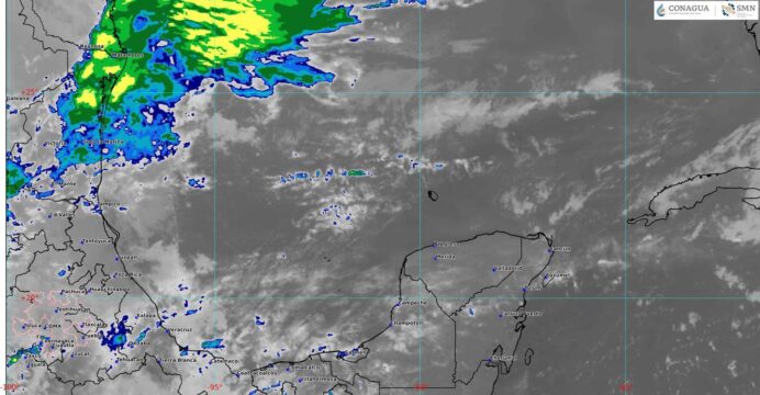 Por otra parte, el frente frío número 45 se mantiene con características de estacionario sobre el Golfo de México, extendiéndose desde Tabasco hasta el sur de Florida, Estados Unidos.