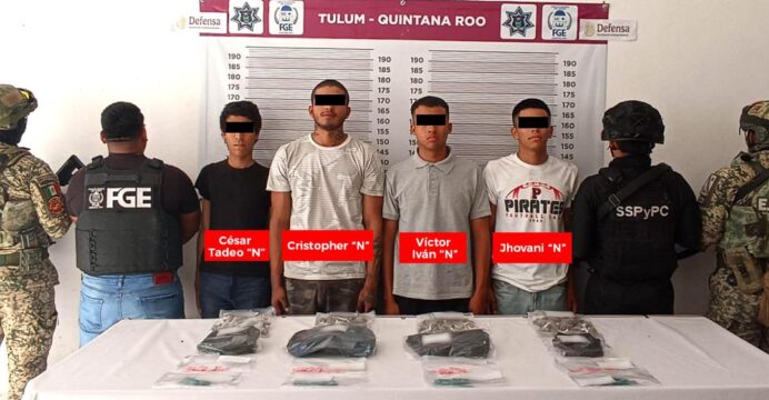 Los detenidos son Cristopher “N”, César Tadeo “N”, Víctor Iván “N” y Jhovani “N”, quienes fueron detenidos en las inmediaciones de la carretera Tulum–Boca Paila, a la altura de la playa Punta Piedra, en este municipio.
