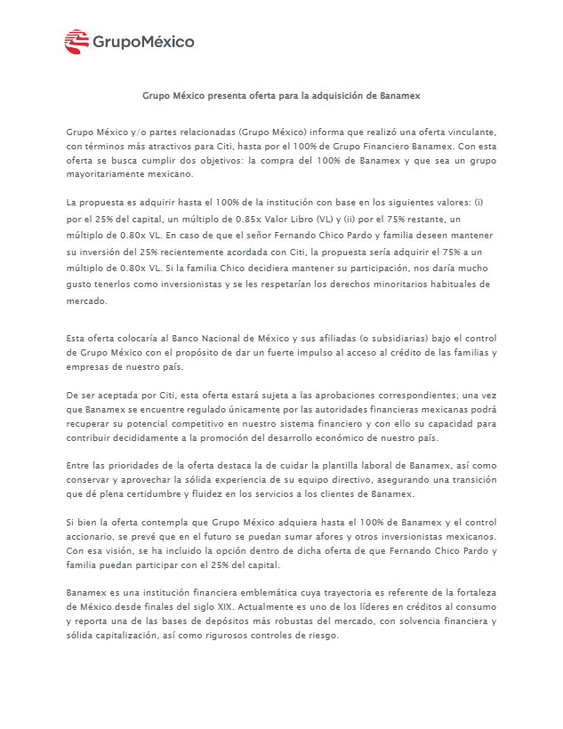 Grupo México informó que presentó a Citi una oferta para adquirir hasta el 100% de Banamex y mantenerlo bajo control mayoritariamente mexicano