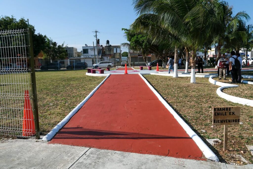 Además, se realizaron trabajos de resane de grietas, perfilado de bancas, colocación de terracota en el interior del parque y señalización para delimitar áreas de juegos, andadores y circulación. Mara Lezama destacó que la señalética está en lengua Maya, importante para abrazar nuestra identidad, cultura y lengua.