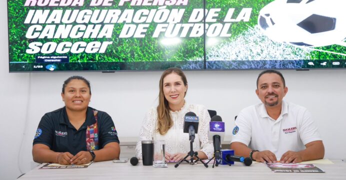 La presidenta municipal, Atenea Gómez Ricalde, anunció durante su rueda de prensa de este lunes que este martes 21 de abril se llevará a cabo la inauguración de la nueva cancha de futbol soccer en la colonia Salinas, como parte de las acciones para fortalecer el deporte y el bienestar de las familias isleñas.