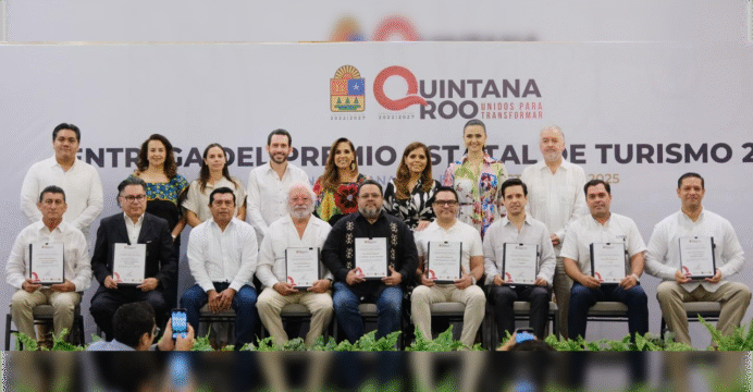 La gobernadora Mara Lezama Espinosa entregó el Premio Estatal de Turismo 2025 a la empresa comunitaria Community Tours Sian Ka’an durante un evento que se celebró en este destino turístico de clase mundial y que recibió su presidente Alberto Cen Caamal.