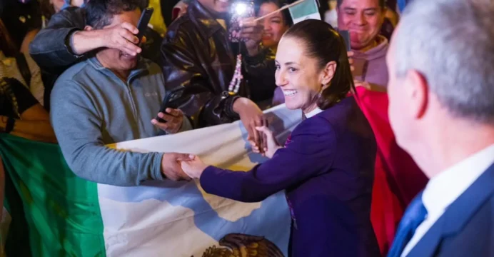 Durante esta interacción, la presidenta saluda a las personas que se le aproximan, rodeada de un fuerte dispositivo de guardaespaldas, en contraste con sus apariciones públicas en México.