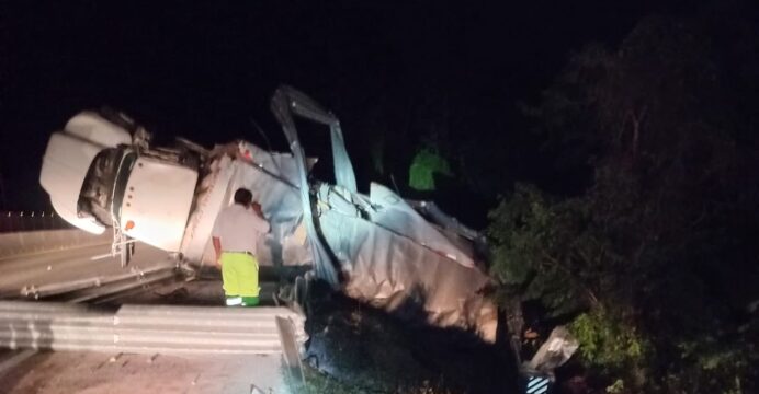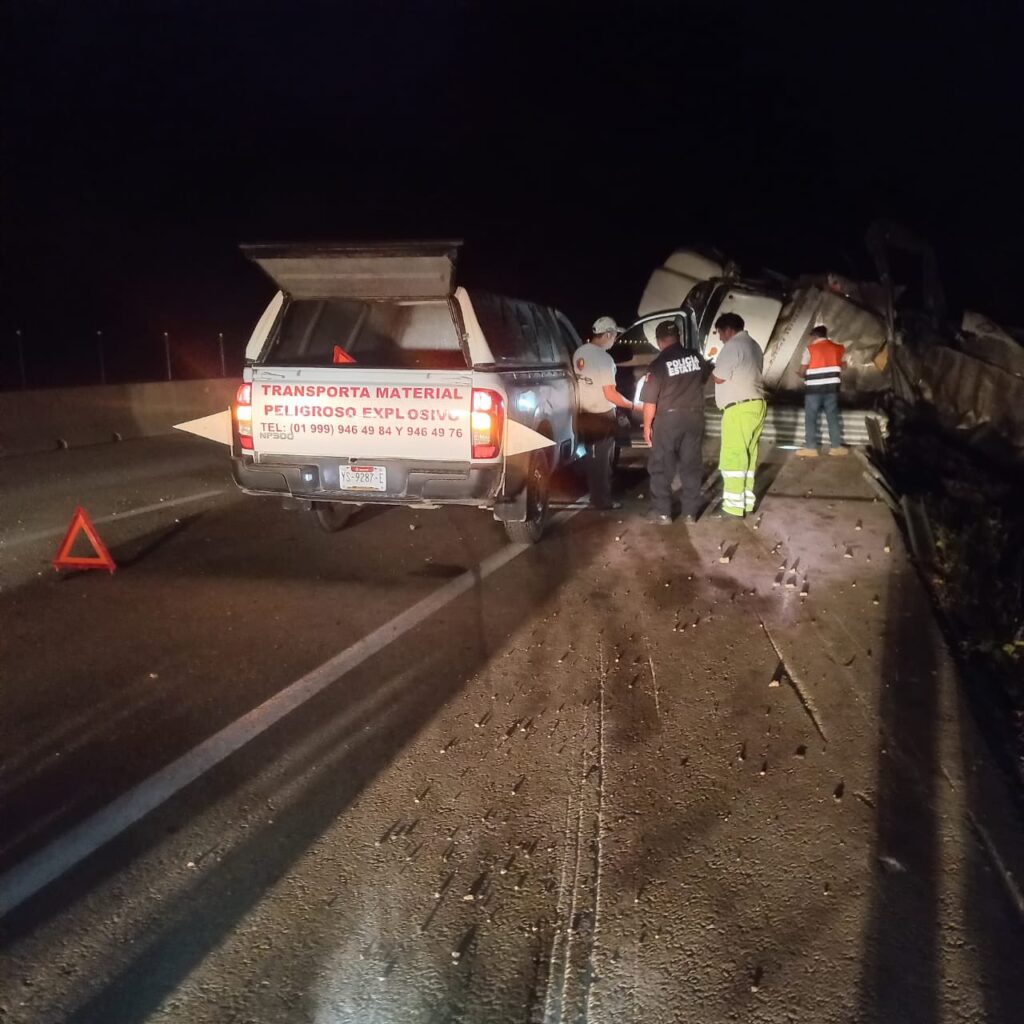 Mérida.- La atención a la volcadura de un camión que transportaba material explosivo en la autopista Mérida-Cancún se mantiene activa, con presencia de corporaciones de seguridad y protocolos especiales en la zona.